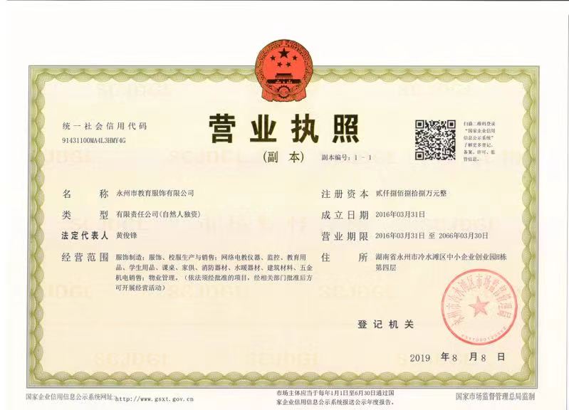 永州市教育服飾有限公司成立于2016年,注冊資金2888萬元,位于湖南省永州市冷水灘區中小企業創業園H棟四樓。公司是一家生產銷售高品質校園服飾、單位制服的企業,是一家集研發、設計、生產一體化的服裝企業,專業生產學生四季服裝和各種服飾的高端產品。公司占地面積2000多平方米,擁有寬敞、整潔、現代化的生產車間,電腦生產設備200多臺(冚車、平車、釘扣機等),獨具特色的樣板間100多平方面米;現代化辦公室100多平方米,年產量達25萬件。公司遵循“以人為本,創新、進取、服務為源、真誠務實、品質至上、優質、求精”的企業宗旨;推行“勇于追求、敢于否定、不斷創新、持續改進”的企業理念;并以追求卓越作為自己的奮斗目標,采用“賽馬不相馬”的人才機制;推行“企業文化先行”的市場戰略;更多的致力于創造屬于品牌自身的獨特文化,展現一種新的服飾概念。